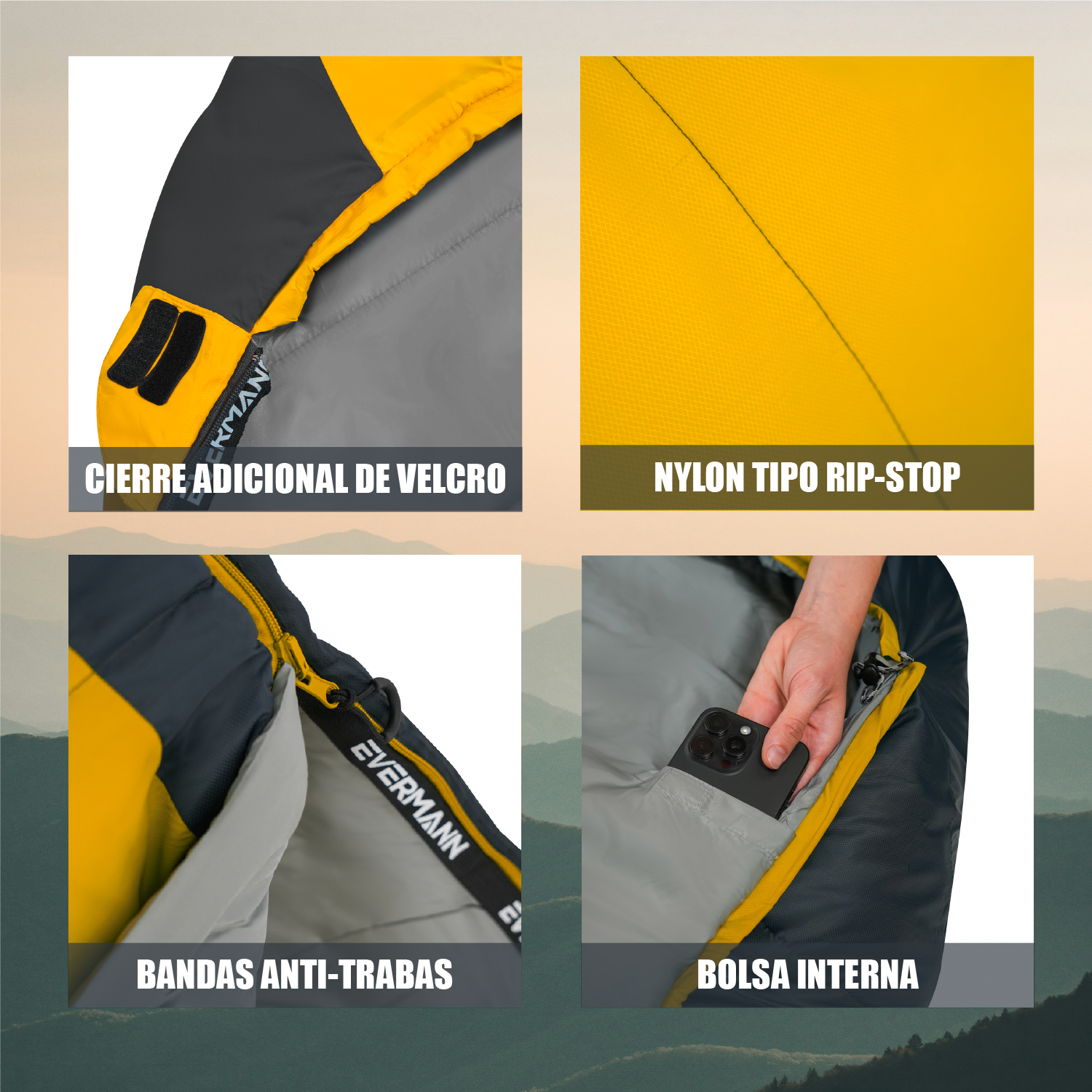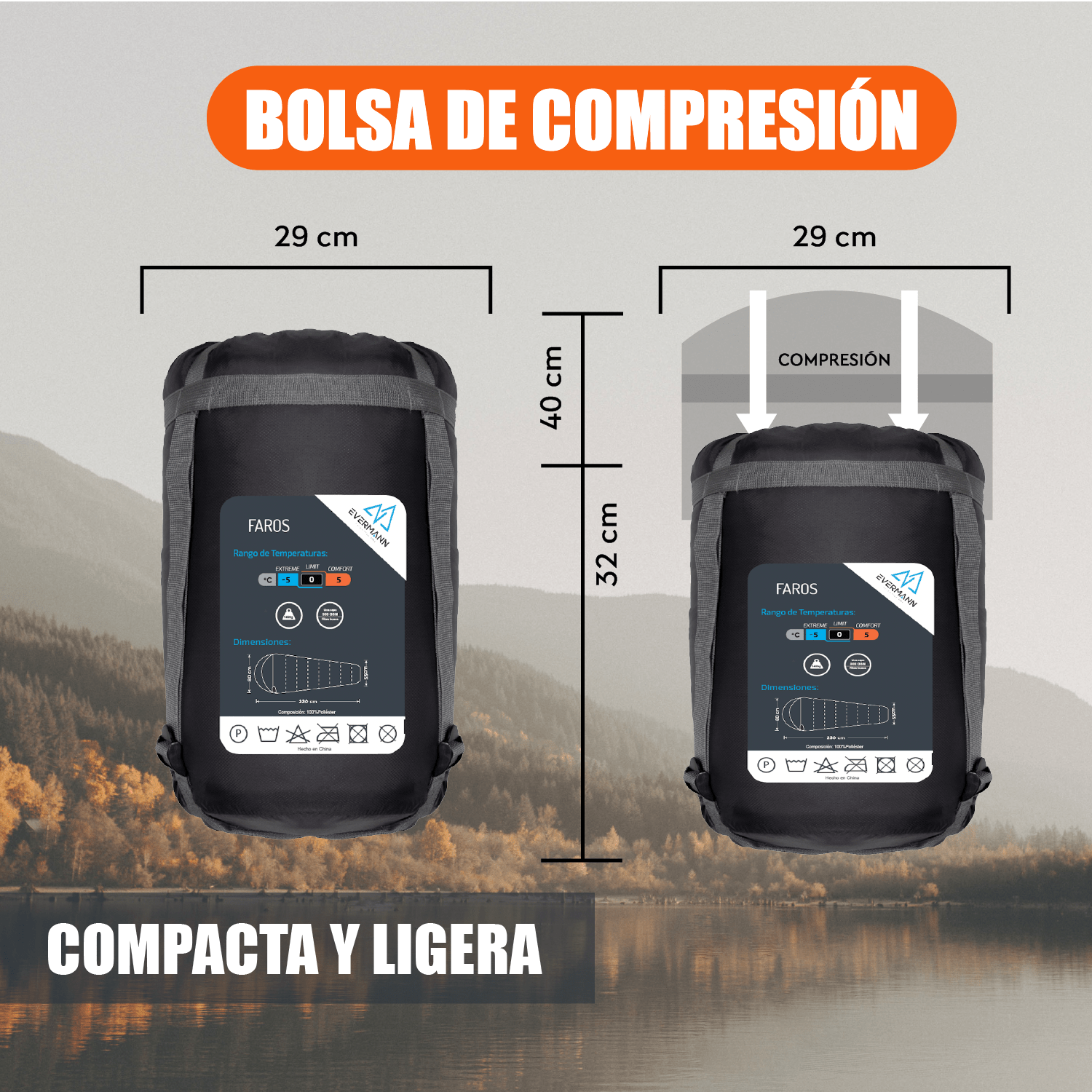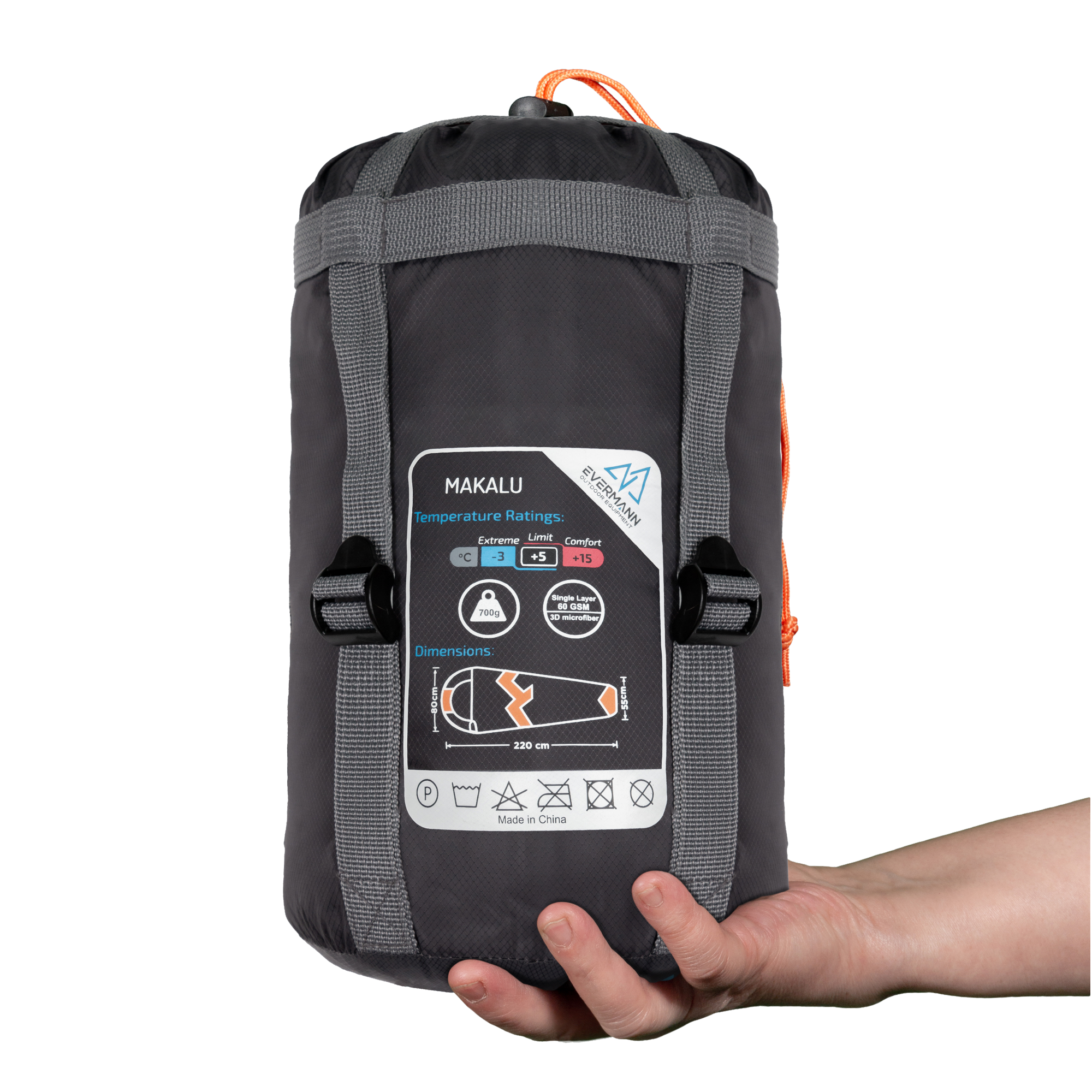 El Sleeping Bag Makalu es nuestra saco de dormir ligero y compacto, con una bolsa de compresión incluida y con un peso total de 700g.